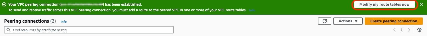 After you accept the peering request, select Modify my route tables now. This button can be found in the green header once the peering connection is active.