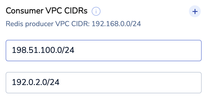 Setting Description Consumer AWS Account Your AWS account ID (see Finding your AWS account ID) Consumer region AWS VPC region Consumer VPC ID The VPC ID for the application that needs to access your Redis Cloud VPC (see Finding a VPC ID) Consumer VPC CIDRs CIDR-formatted IP addresses for the AWS VPC that needs to access your Redis Cloud VPC; must not overlap with the Redis producer VPC CIDR (see View your VPCs) -