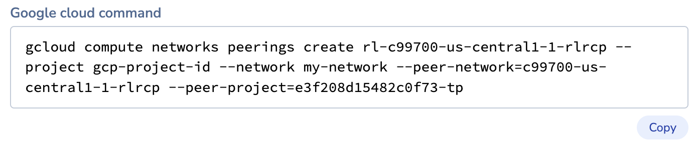 Copy the Google cloud command after you enter the other VPC peering settings. You need this command to accept the peering request later: