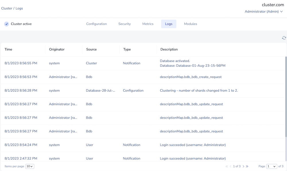 Redis Enterprise provides log files for auditing cluster management actions and troubleshooting. You can view these logs in the UI and on the host operating system.