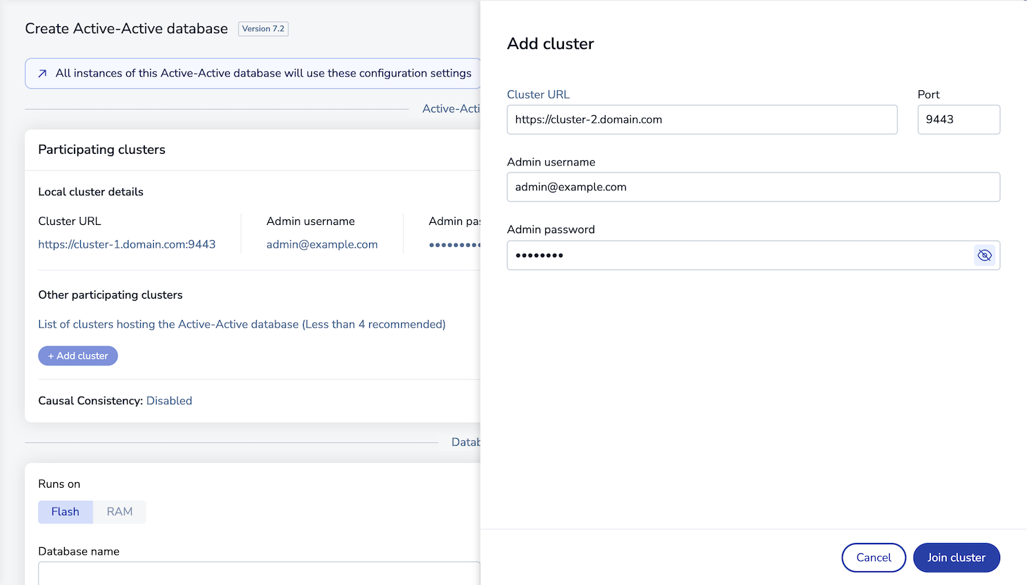 Note:You cannot add RAM-only clusters and flash-enabled clusters to the same Active-Active configuration. -