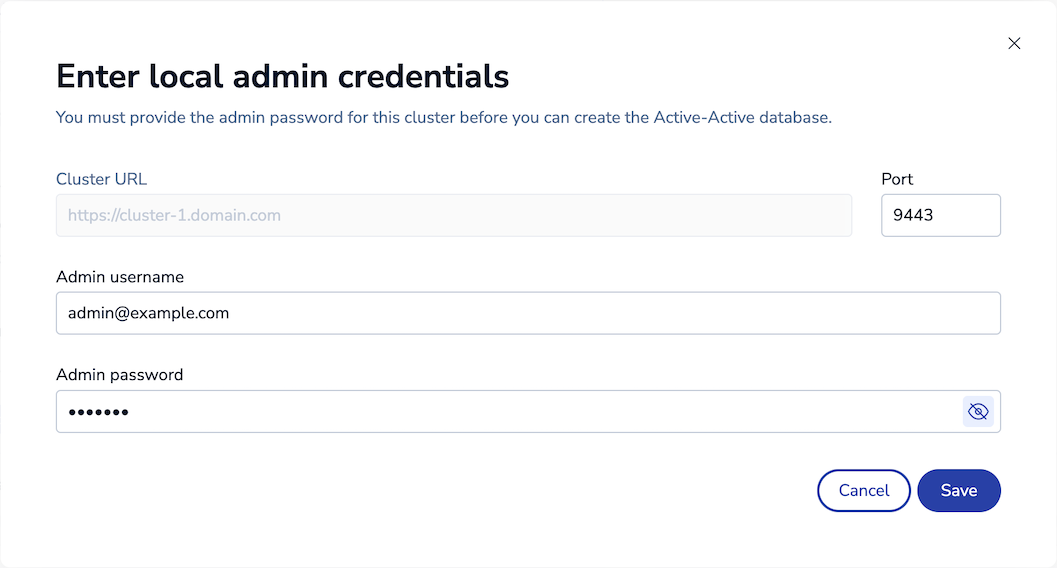 Enter the cluster's local admin credentials, then click Save: