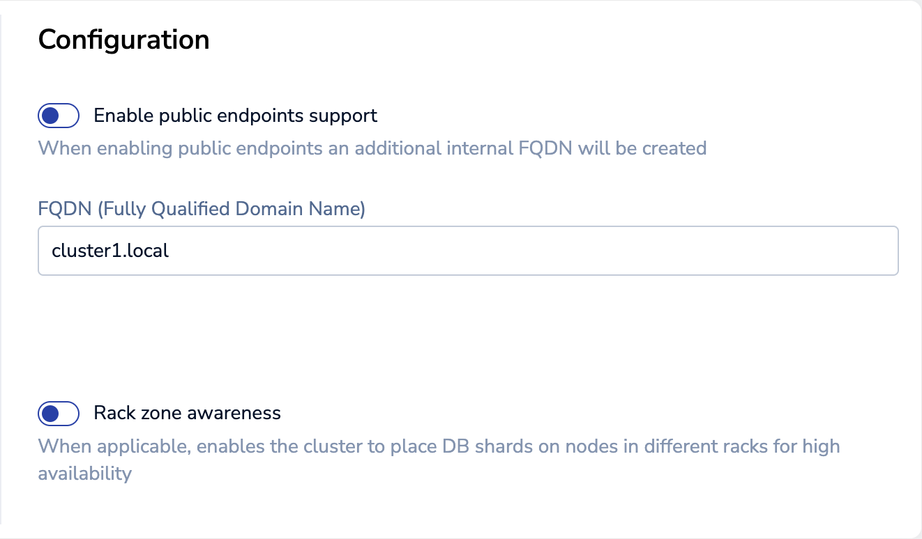 In the Configuration section of the Cluster settings page, enter a cluster FQDN, for example