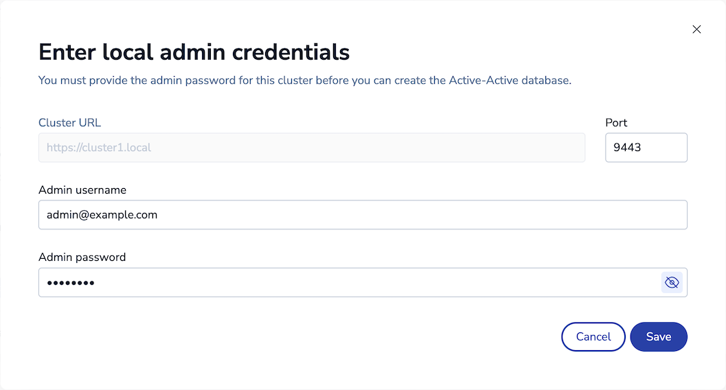 After the Active-Active database is created, sign in to the Cluster Manager UIs for cluster 1 at
