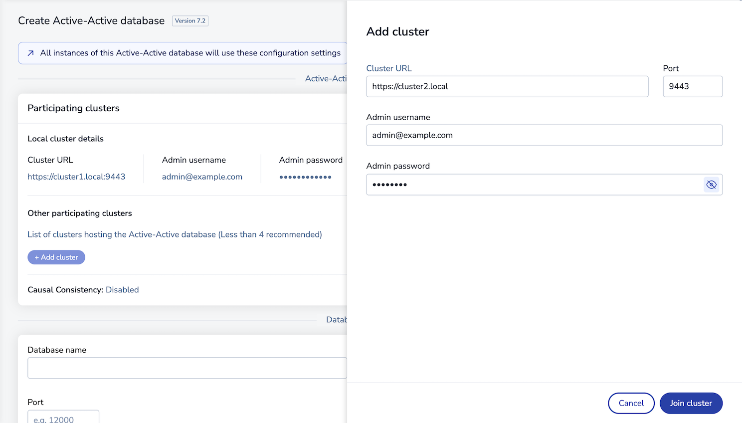 In the Other participating clusters list, add the address and admin credentials for the other cluster: