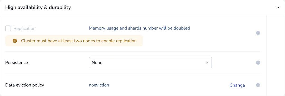 In the High availability & durability section, turn off Replication since each cluster has only one node in this setup: