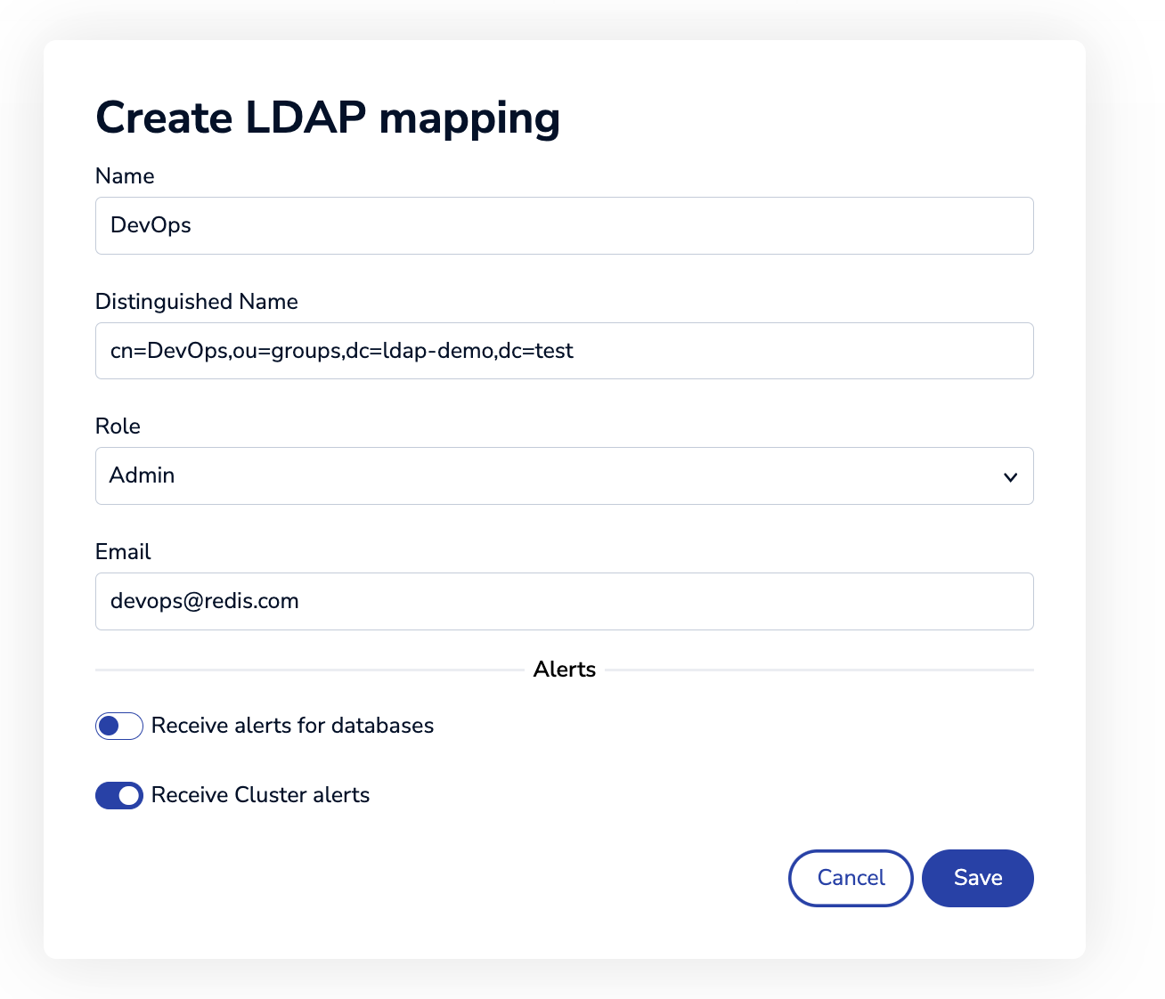 Example:cn=admins,ou=groups,dc=example,dc=comRole The Redis Software access control role defined for this group Email (Optional) An address to receive alerts Alerts Selections identifying the desired alerts.
